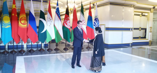 H.E. Smt Sushma Swaraj, External Affairs Minister of India being received by H.E. Mr Dmitry Medvedev, Prime Minister of the Russian Federation, on the occasion of official reception in honour of participants of the Meeting of Council of Government of SCO Member States, 30 Nov 2017, Sochi.