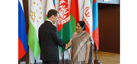 - EAM being received by Russian PM on her arrival at the venue for Council of SCO Heads of Govt. meeting at Sochi.