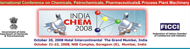 “Strategic Partnership-Key to Success” FICCI jointly with Dept of Chemicals & Petrochemicals, Ministry of Chemicals & Fertilizers, Govt. of India is organizing INDIACHEM 2008, the international exhibition and conference on Chemicals, Petrochemicals, Pharmaceuticals, Process Plant & Machinery on October 20-22, 2008 at Mumbai. This follows the immense success of the earlier four editions in 2000 and 2002 at New Delhi, 2004 and 2006 at Mumbai.