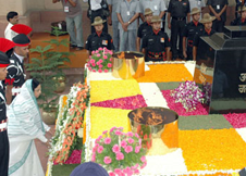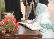 The President, Smt. Pratibha Devisingh Patil signing visitors book at the Amar Jawan Jyoti, India Gate, after paying homage to martyrs |