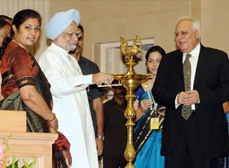 The Prime Minister, Dr. Manmohan Singh lighting the lamp at the launch of the Saakshar Bharat Mission for Female Literacy on International Literacy Day,
