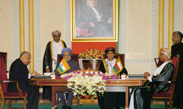 The Prime Minister, Dr. Manmohan Singh and the Deputy Prime Minister of Oman, Mr. Sayyid Fahd Mahmoud Al Said, witnessing the signing of agreement between Indo-Oman on Joint Investment Fund, in Muscat on November 08, 2008. |