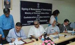 The Union Minister of Overseas Indian Affairs, Shri Vayalar Ravi witnessing the signing of Memorandum of Understanding between the Ministry of Overseas Indian Affairs (MOIA) and Confederation of Indian Industry (CII) on Know India Programme, in New Delhi on August 13, 2007. |