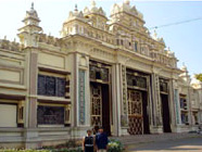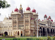 Designed by the English Architect, Henry Irwin, the Mysore Palace dominates the skyline of Mysore. A three storied structure in the Indo-Saracenic style built between 1897-1912, the palace has beautifully designed square towers at cardinal points, covered with domes. The Durbar Hall with its ornate ceiling and sculpted pillars and the Kalyanamantapa (Marriage Pavilion) with its glazed tiled flooring and stained glass, domed ceiling are worth noting. Intricately carved doors, the golden howdah (elephant seat), paintings as well as the fabulous, jewel encrusted golden throne (displayed during Dasara) are amongst the palace's other treasures. The walled palace complex houses the Residential Museum (incorporating some of the Palace's living quarters), temples and shrines including the Shwetha Varahaswamy temple. The palace is illuminated on Sundays, Public Holidays as well as during the Dasara Celebrations when 97,000 electric bulbs are used to illuminate it.