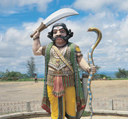 A prominent landmark, located at the outskirts of the city, Chamundi Hills can be reached by a 13 kms motorable road or 1000 steps built by the Wodeyars. At the crest of this hill is Sri Chamundeshwari Temple that dates back to the 11th century. The striking gopura (Pyramidal Temple tower) was added by Maharaja Krishnaraja Wodeyar-III in 1825-1826. Goddess Chamundi was the patron deity of the rulers. Near the temple is the statue of Mahishasura, the demon slayed by the goddess Chamundeshwari. Half way up the stone steps, is the 4.8 meter high monolith of Nandi, Lord Shiva's mount.