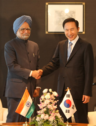 The Prime Minister, Dr. Manmohan Singh meeting with the President of Republic of Korea, Mr. Lee Myung Bak, during the G-8 Summit at Sapporo, in Japan on July 08, 2008.