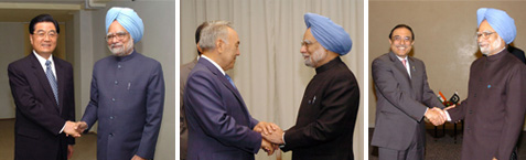 1. The Prime Minister, Dr. Manmohan Singh meeting the President of China, Mr. Hu Jintau; 2. The Prime Minister, Dr. Manmohan Singh meeting the President of Kazakhstan Mr. Nursultan Nazarbayev; 3. The Prime Minister, Dr. Manmohan Singh meeting the President of Pakistan, Mr. Asif Ali Zardari |