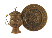 vessels are also produced in the Kashmir Valley. Copper samovars, ornamental glasses and water jugs are no't merely utilitarian but indicate a dedication to beauty. Brass, first produced in India by fusing zinc with copper, over two thousand years ago, gets its expression in Moradabad, Uttar Pradesh, the largest centre for hand engraved brass.