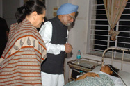 The Prime Minister, Dr. Manmohan Singh enquiring about the health condition of a critically injured person in recent terror attack, during his visit at J.J.hospital, in Mumbai on November 27, 2008.